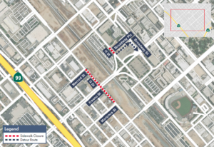 - Southbound H Street to Fresno Street Underpass via sidewalk will be detoured east on Broadway Plaza, then south on Broadway Street to Fresno Street.