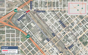 Road closure along Divisadero Street between G Street and Roosevelt Avenue in Fresno for utility work.
