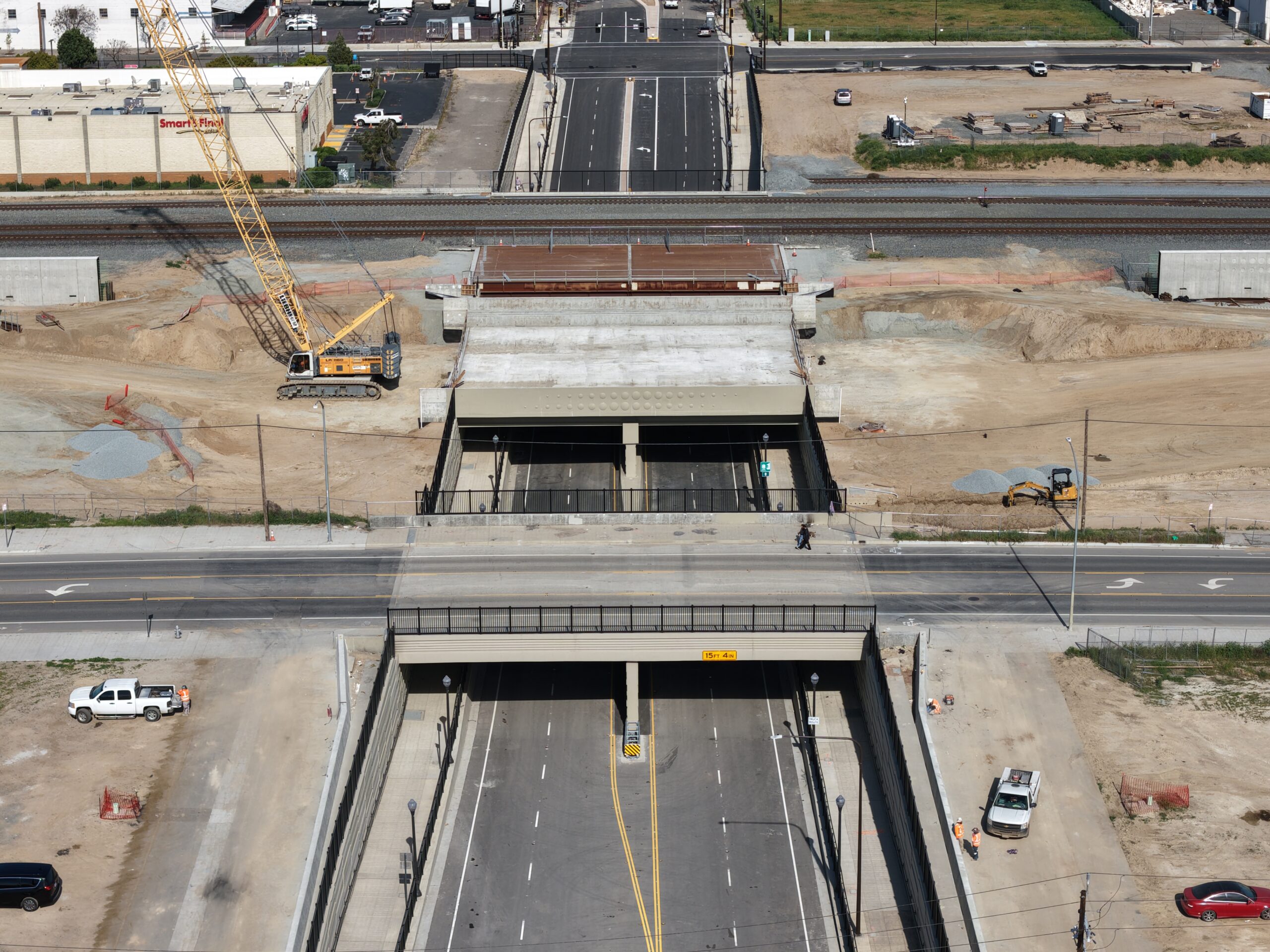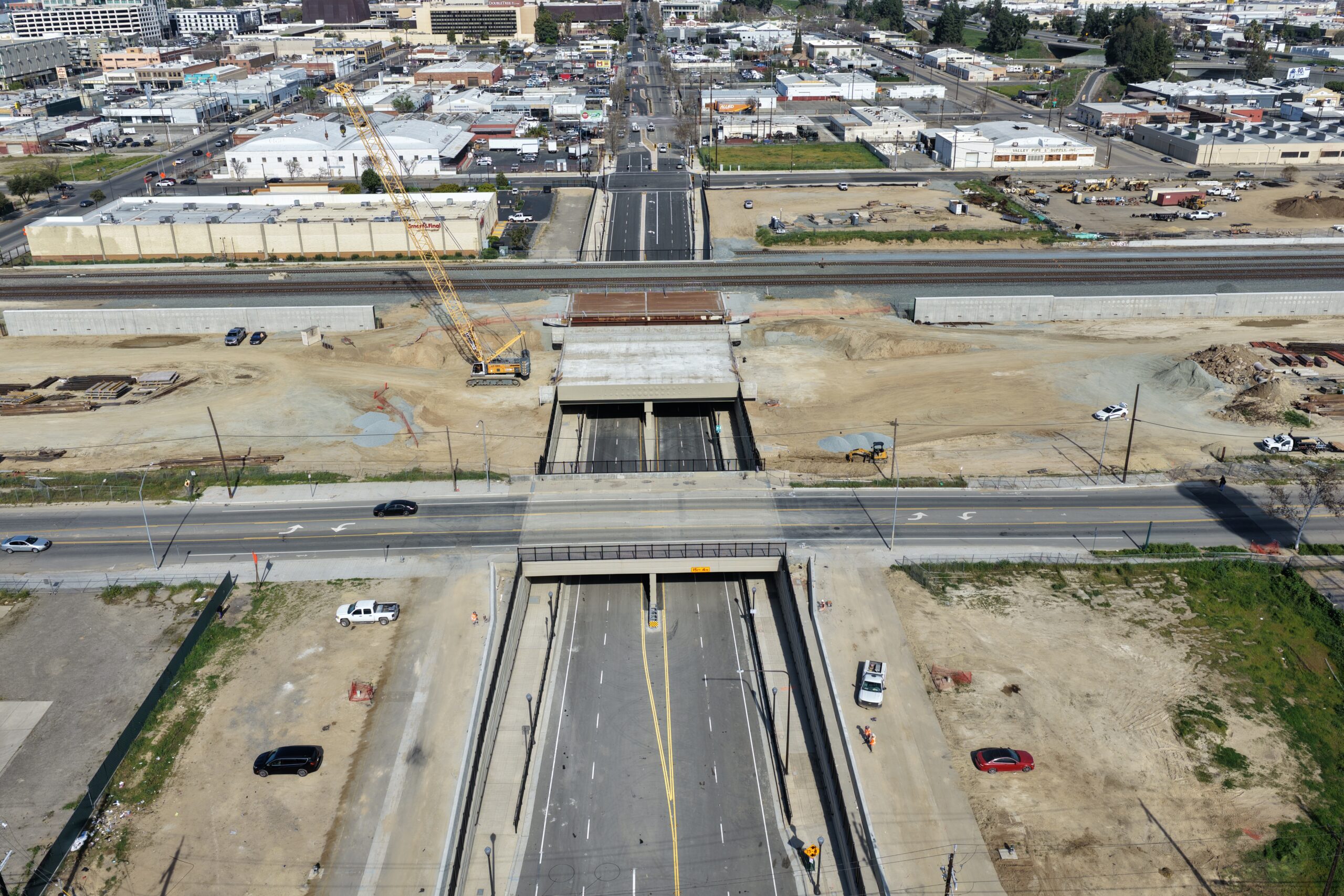 At the Cesar Chavez Underpass (formerly known as the Ventura Street Underpass), crews continue to work on the construction of the Cesar Chavez Boulevard and H Street intersection by installing the streetlight infrastructure for the underpass. Shoring and pile drilling is currently in progress to allow for the completion of the Union Pacific bridge and high-speed rail bridge, which will take trains over the underpass. When complete, the underpass will serve as a grade separation and will eliminate the previous Union Pacific at-grade railroad crossing, allowing traffic to travel underneath the existing railroad and future high-speed rail tracks.