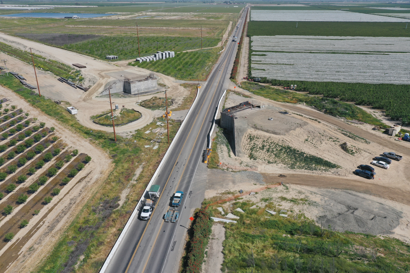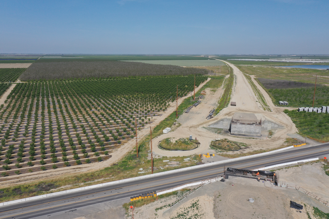 Driving along State Route (SR) 43, you can see more than 150,000 cubic yards of embankment fill that has been placed to form the guideway on both sides of the Tied Arch Bridge. The guideway is where future high-speed trains will travel before it crosses over the highway and traffic, between Fresno and Kings counties. The Tied Arch Bridge spans 249-feet long and 52-feet wide.