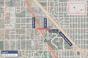 - Intermittent lane and shoulder closures along Olive Avenue, between Crystal Avenue and Golden State Boulevard;