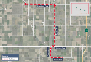 Materials will be transported west on Davis Avenue, north on Fowler Avenue, east on Elkhorn Avenue, north on Fowler Avenue, and west on Mountain View Avenue to a high-speed rail construction site.