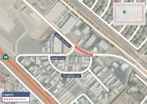 announces intermittent lane closures along Golden State Boulevard between Barstow and San Madele avenues in Fresno for road work. Work is scheduled