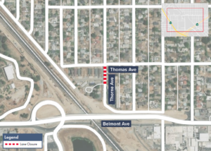 Fresno, Calif. – The California High-Speed Rail Authority (Authority), in cooperation with design-build contractor Tutor-Perini / Zachry / Parsons (TPZP), announces intermittent lane closures along Thorne Avenue between Belmont and Thomas avenues in Fresno for utility work. Work is scheduled from 9 p.m. to 6 a.m. starting Sunday, Dec. 14 through Tuesday, Dec. 16, 2025.