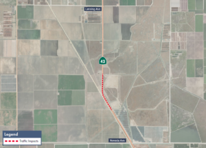 Intermittent traffic impacts SR 43, between Nevada and Lansing avenues in Kings County for road work.