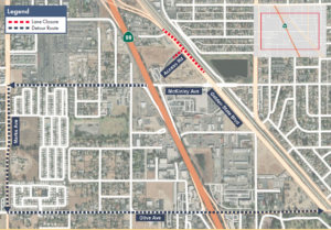 - Lane closures along Golden State Boulevard between McKinley Avenue and Access Road;