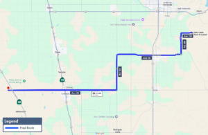 • Materials will be hauled west on Avenue 120 in Porterville, CA; south on Road 264, west on Avenue 95/Terra Bella Avenue, south on Road 192, and west on Avenue 56/Sierra Avenue to a high-speed rail construction site.