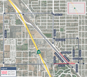 - Eastbound traffic along Olive Avenue to northbound Weber Avenue will be detoured north on Golden State Boulevard, east on Clinton Avenue, then south on West Avenue to Weber Avenue.
