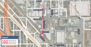 • Traffic along Railroad Avenue will be detoured east on Florence Avenue, north on East Avenue, then west on California Avenue to Van Ness Avenue.