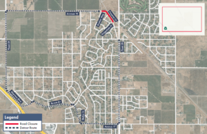 - Northbound traffic along Hanover Drive will be detoured south on Road 26, west on Avenue 17, north on Melba Drive, west on Brook Drive, west on Schmidt Creek Way, north on Sharon Boulevard, north on Road 24, then east on Avenue 19 to Hanover Drive.
