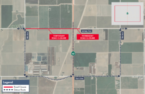 KINGS COUNTY, CALIF. – The California High-Speed Rail Authority (Authority), in cooperation with design-build contractor Dragados-Flatiron Joint Venture (DFJV), announces a road closure along Jersey Avenue, between State Route (SR) 43 and Ninth Avenue in Kings County for construction of a high-speed rail grade separation. Work will continue through March 2026.