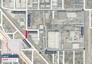 • Traffic going southbound on Van Ness Avenue to southbound Railroad Avenue will be detoured east on California Avenue, south on East Avenue, then west on Florence Avenue to Railroad Avenue.