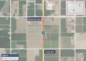 Shoulder closure along northbound State Route (SR) 43 between Iona and Houston avenues in Kings County for work on a high-speed rail structure.