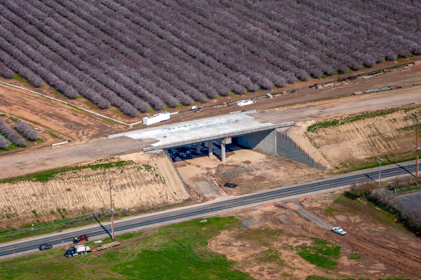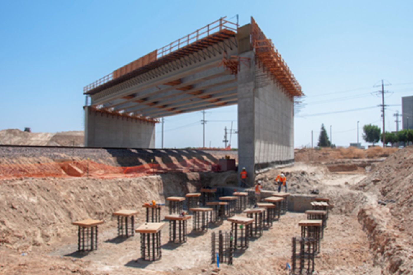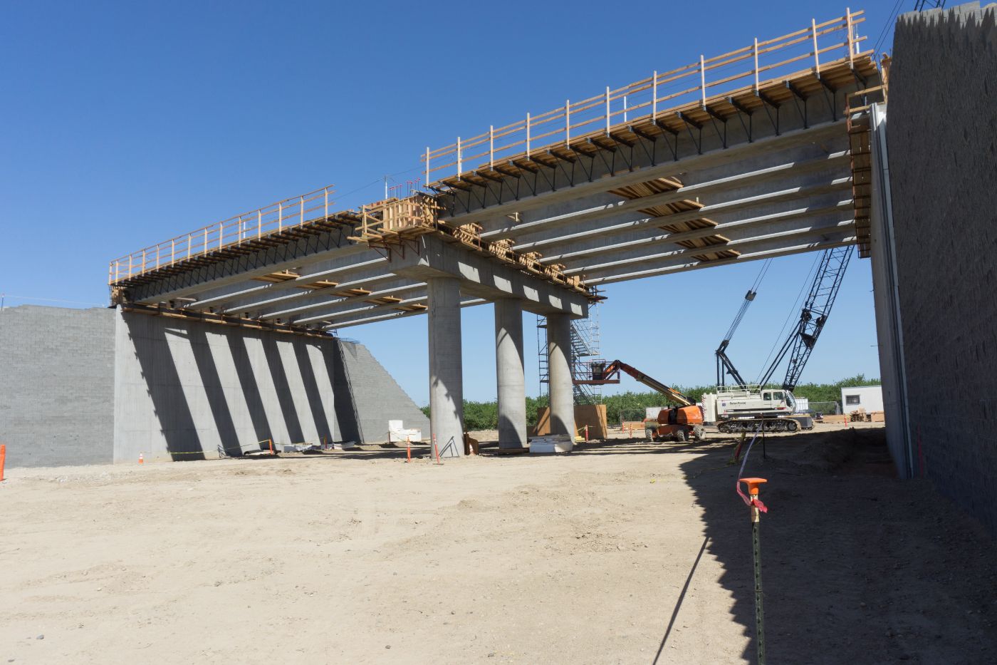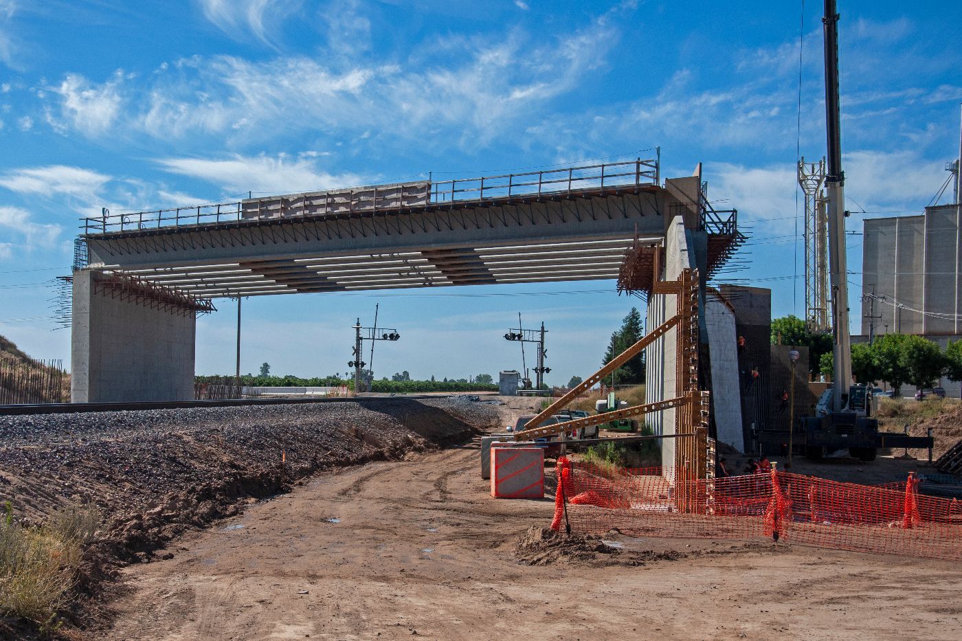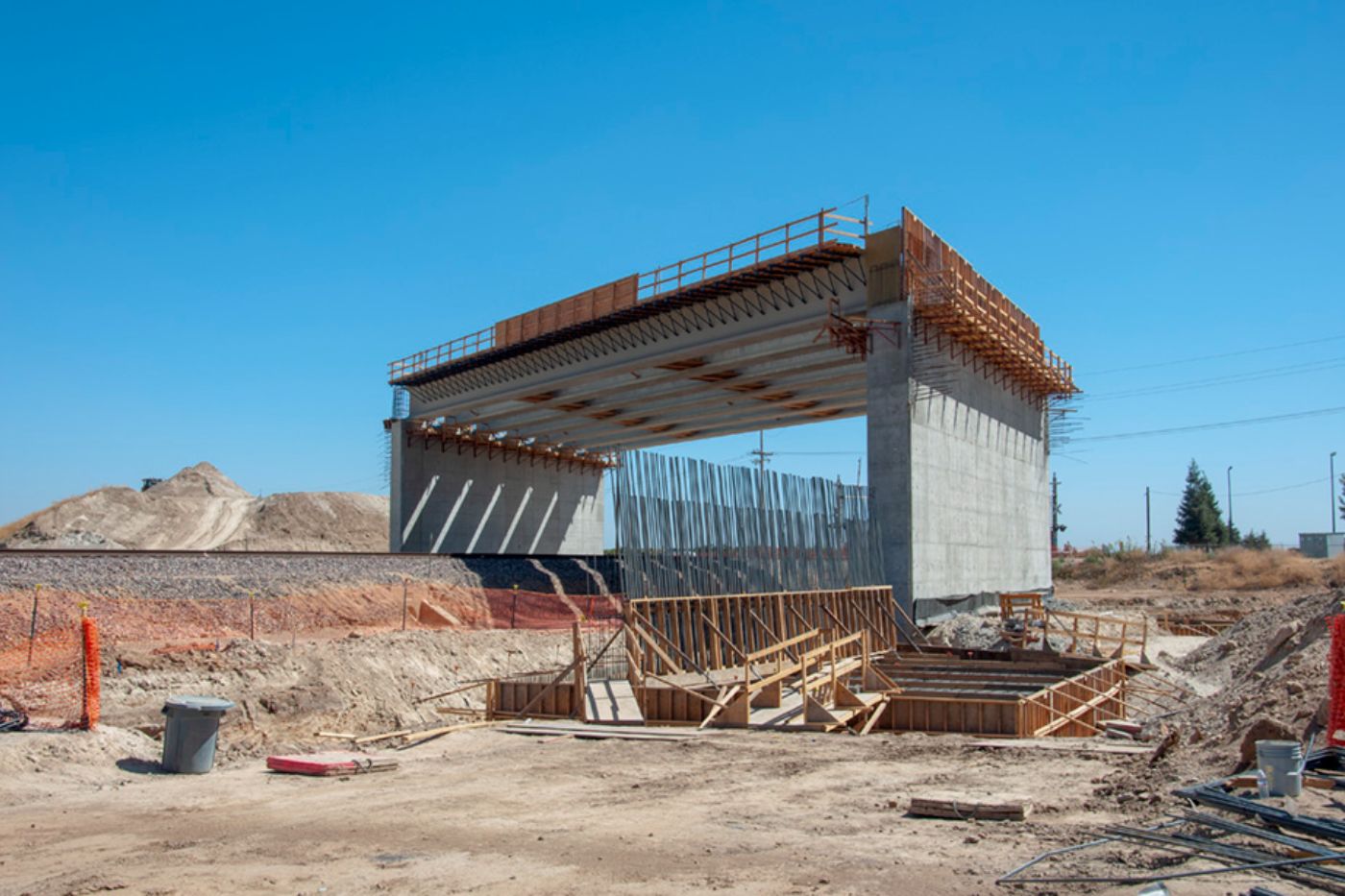 Initial paving has been completed on the west side of the Avenue 12 overcrossing, leading up to the high-speed rail overcrossing bridge section. Meanwhile, crews are at work on the crossing over the BNSF freight lines at the east end of the structure. There, workers tie rebar for a section of the barrier walls off the sides of the abutment. The overcrossing east of Madera Community College will carry Avenue 12 traffic over the high-speed rail line and eliminate the existing freight rail crossing.