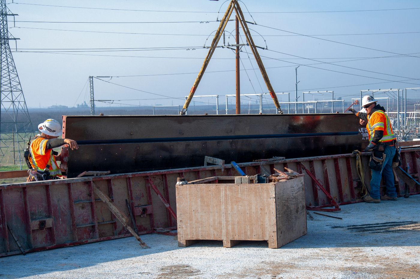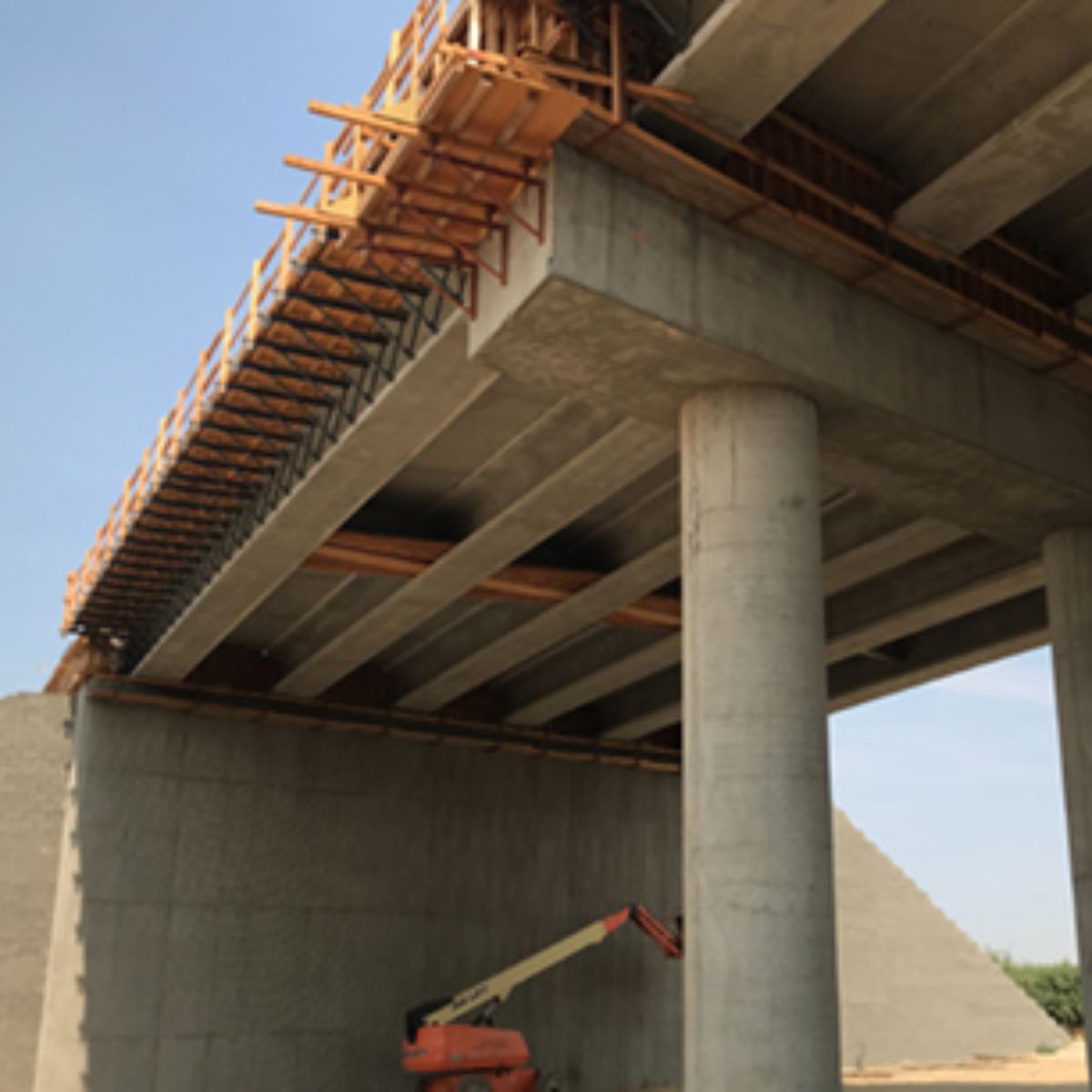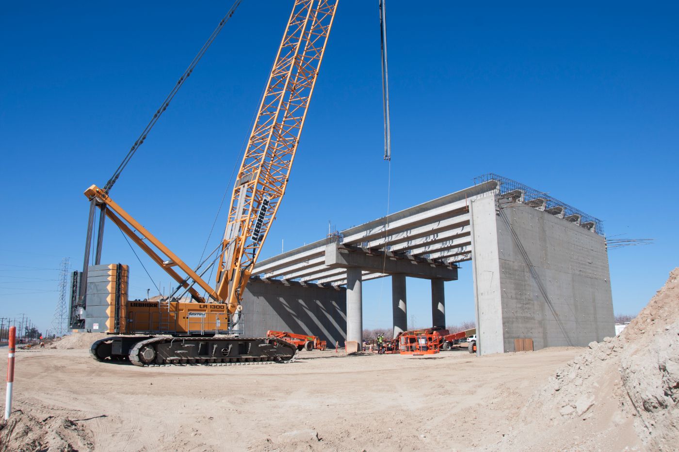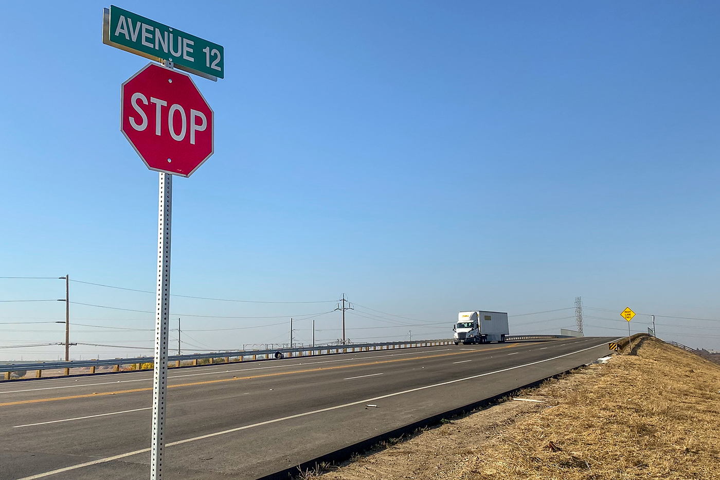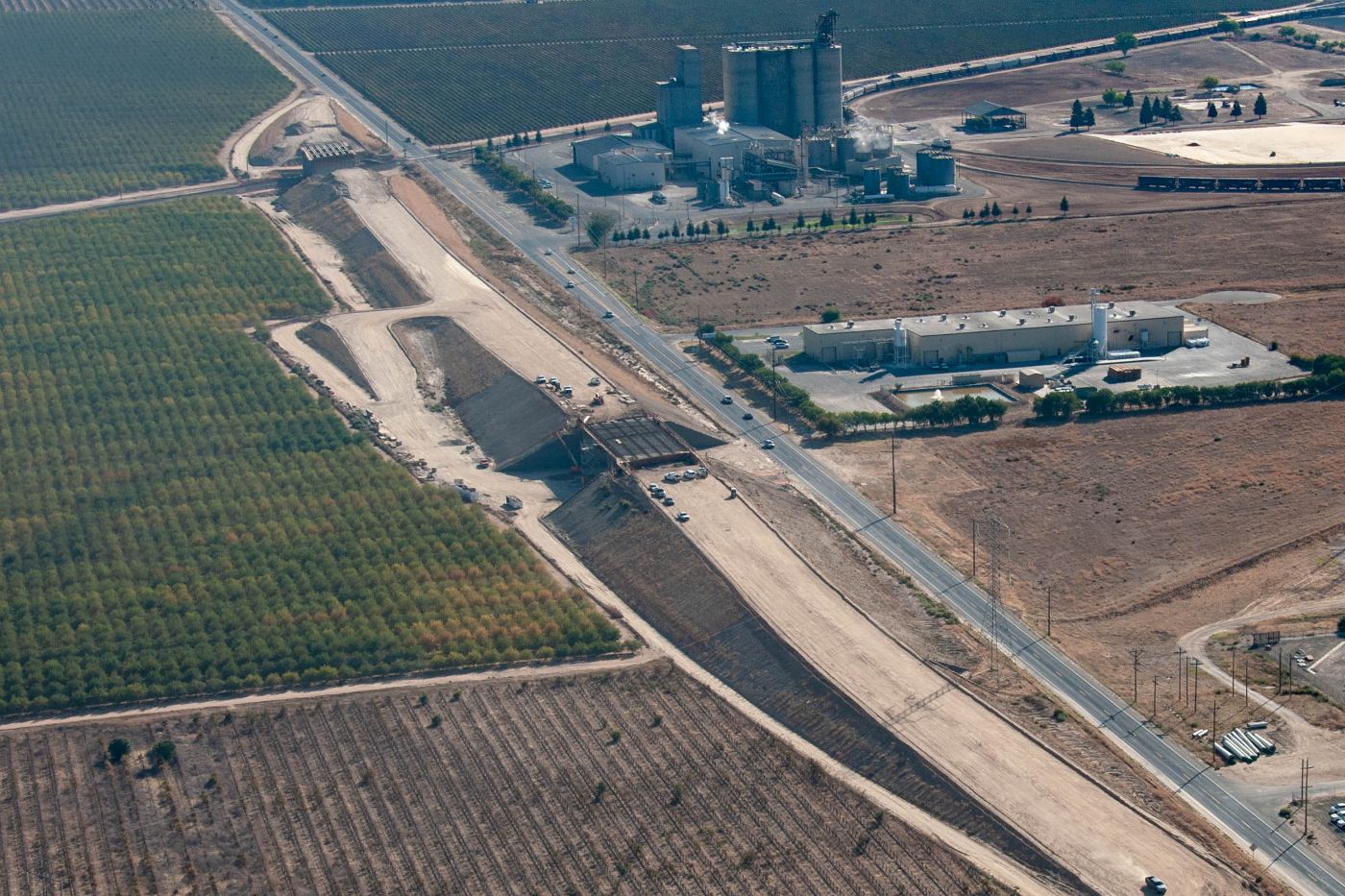 Initial paving has been completed on the west side of the Avenue 12 overcrossing, leading up to the high-speed rail overcrossing bridge section. Meanwhile, crews are at work on the crossing over the BNSF freight lines at the east end of the structure. There, workers tie rebar for a section of the barrier walls off the sides of the abutment. The overcrossing east of Madera Community College will carry Avenue 12 traffic over the high-speed rail line and eliminate the existing freight rail crossing.