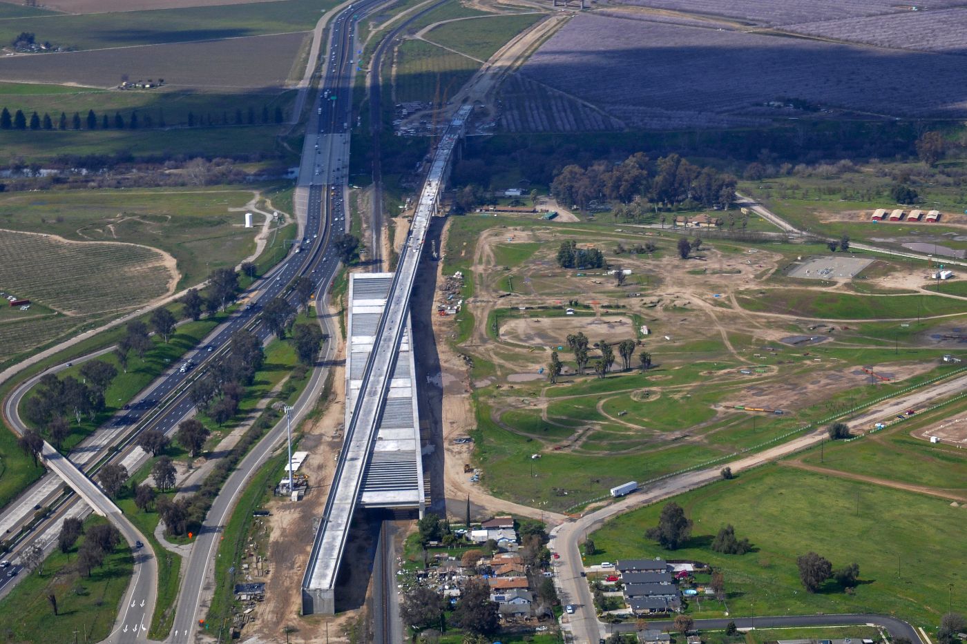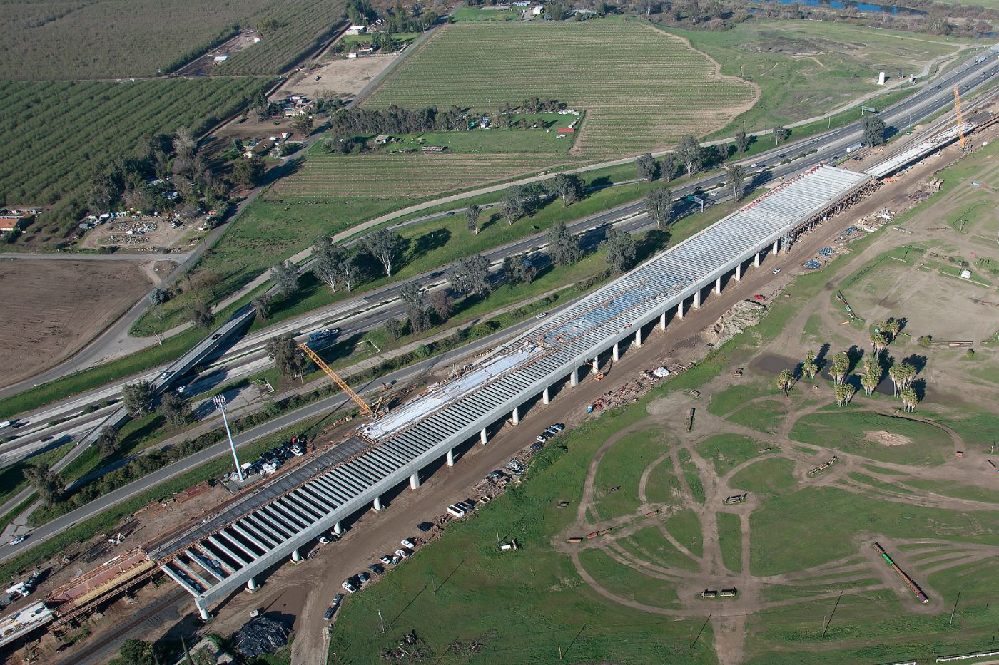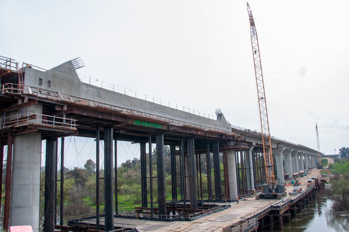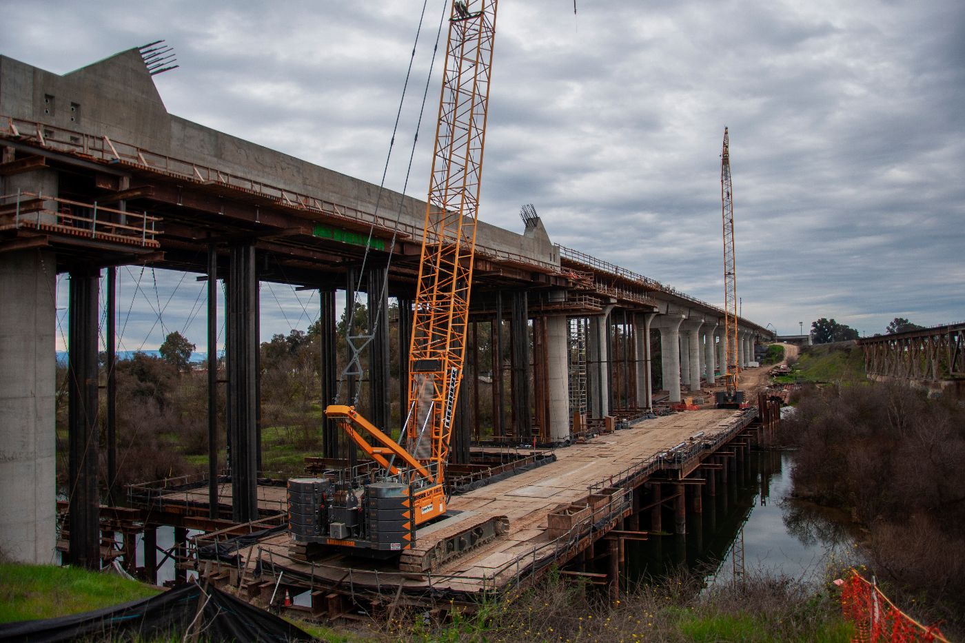 Further south of the San Joaquin River, a large pergola structure was built to allow high-speed trains to cross over the Union Pacific Railroad. A total of 198 girders form the foundation of the lid of the pergola structure. Each girder weighs 156,000 lbs. and is 121-feet long.