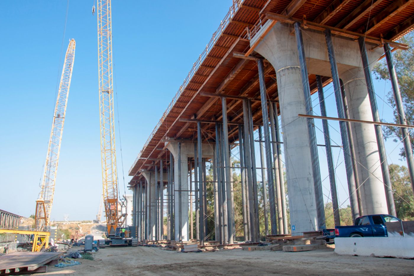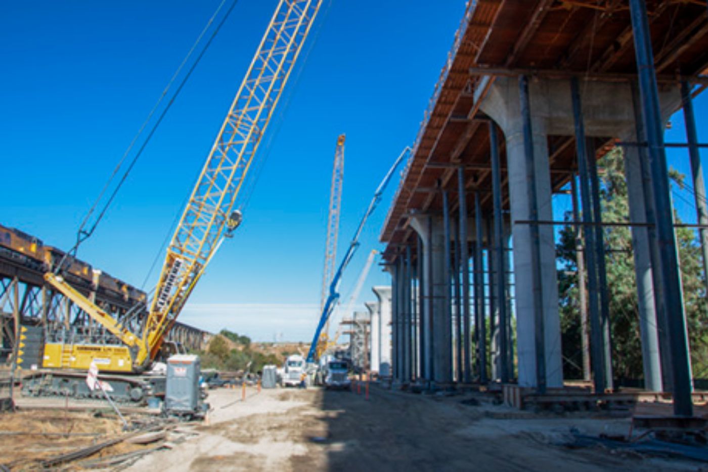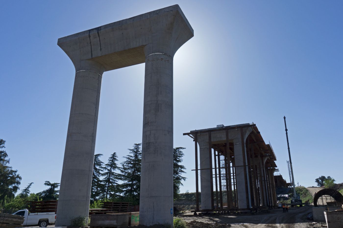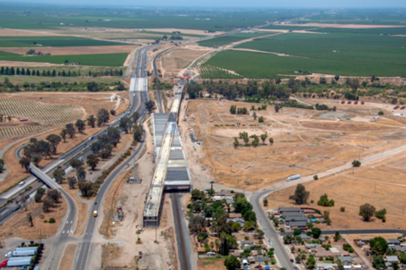 Further south of the San Joaquin River, a large pergola structure was built to allow high-speed trains to cross over the Union Pacific Railroad. A total of 198 girders form the foundation of the lid of the pergola structure. Each girder weighs 156,000 lbs. and is 121-feet long.