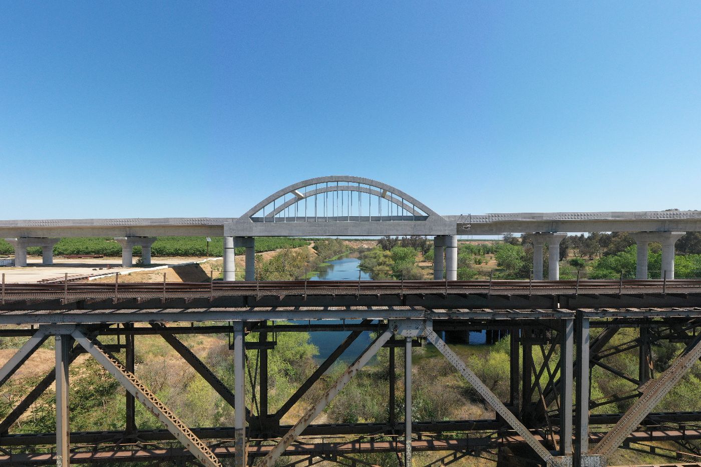 The completed signature arches of the San Joaquin River Viaduct straddle the Fresno and Madera county line and represent the northern gateway into the Central Valley. With the superstructure now complete, crews are putting the final touches on the largest structure in Construction Package 1.