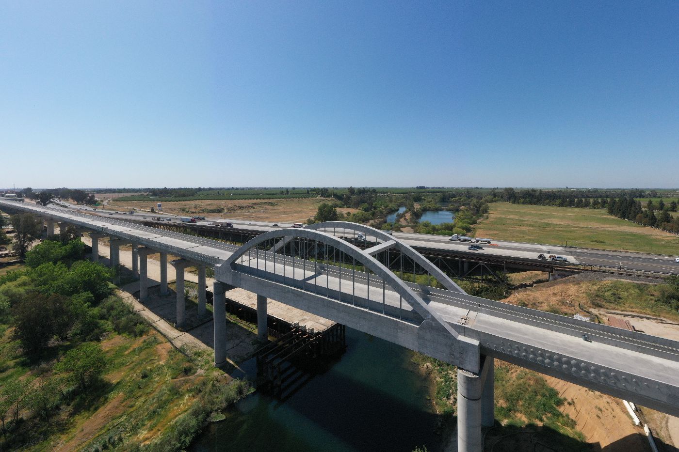 The San Joaquin River Viaduct and Pergola structure spans approximately 4,741-feet long collectively, with the top of the viaduct spanning 43-feet wide. The 210-foot arch span over the San Joaquin River is supported by 20 pre-cast floor beams. Technically, the cast-in-place arches act as suspension bridge support for the bridge deck.