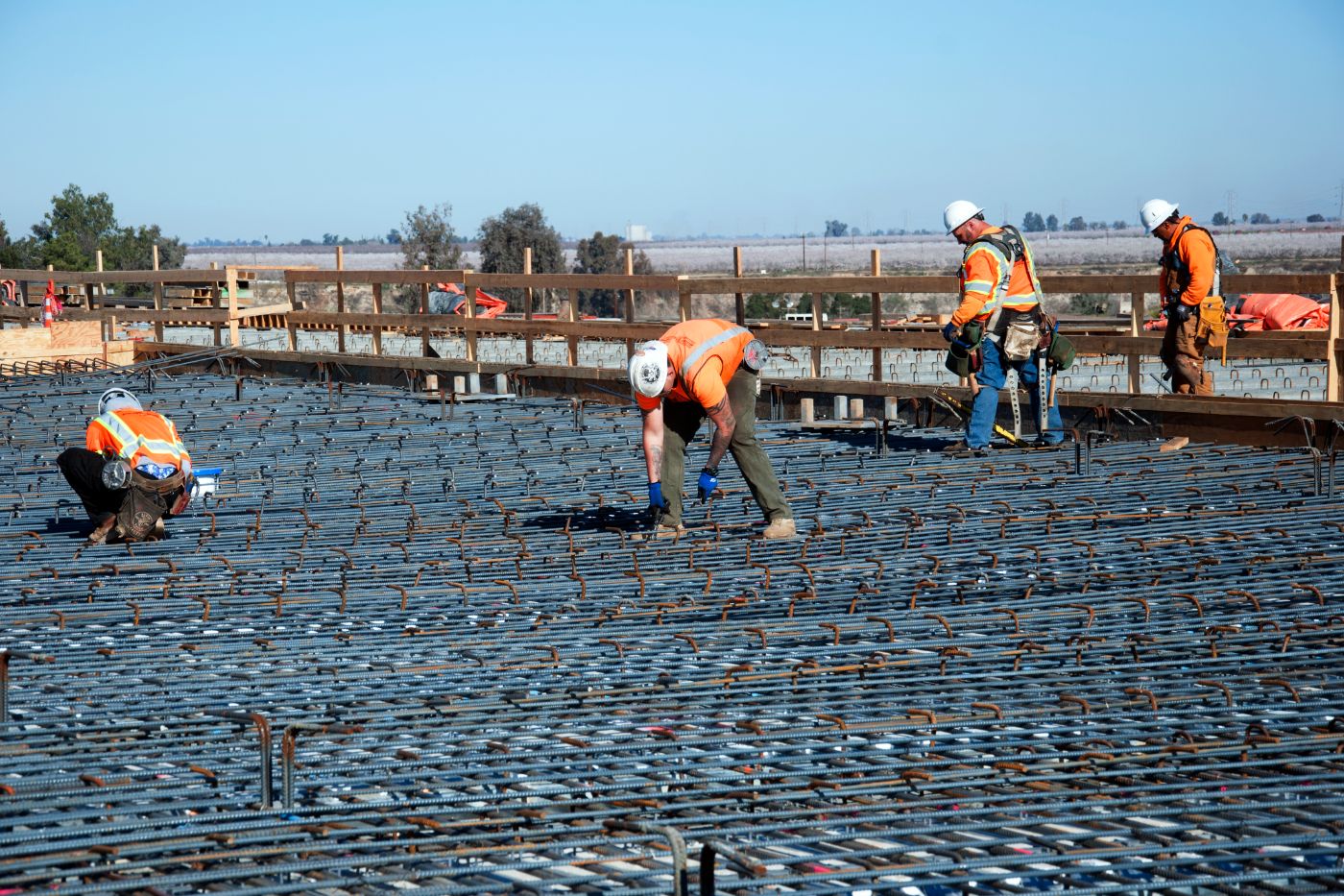 Workers continue constructing the deck of the pergola section of the San Joaquin River Viaduct, tying rebar in preparation for a concrete deck pour. On the south side of the San Joaquin River, other crews build pier caps to tie together the viaduct support columns. The viaduct will carry high speed trains over the river and existing freight tracks to form one of the largest structures on this first phase of high-speed rail construction.