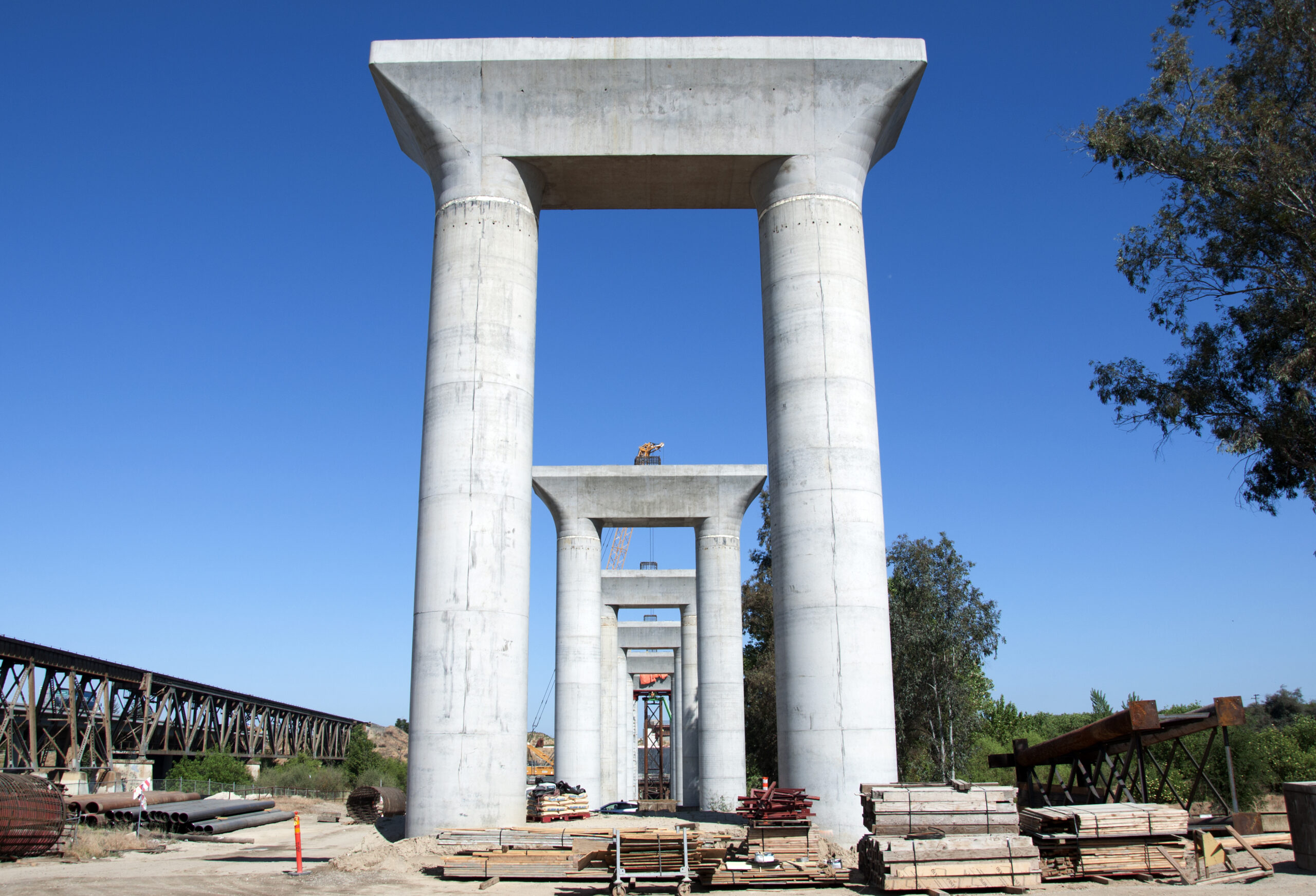 At the San Joaquin River Viaduct, workers have completed concrete pours for much of the pergola deck that will carry high-speed trains over the existing rail line (above). On the south bank of the San Joaquin River, crews are finishing up construction of the remaining support columns, while on the north bank of the river (below), the final pier cap has been poured. The cast-in-place construction of the deck is progressing and will follow with the completion of the pier caps, tying all the individual components of the structure together. The completed viaduct will form one of the largest structures on this first phase of the high-speed rail project.